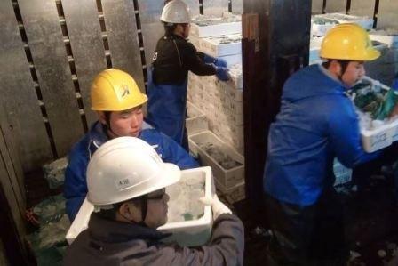 魚倉から積み出し中! 魚市場へ積み出し!