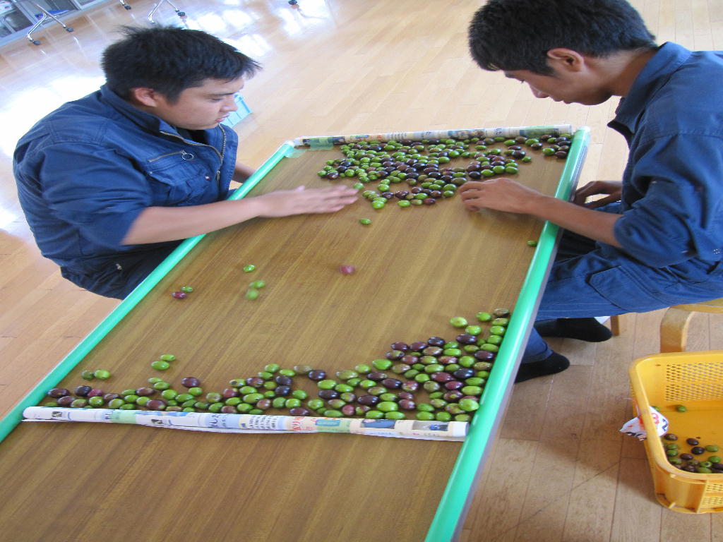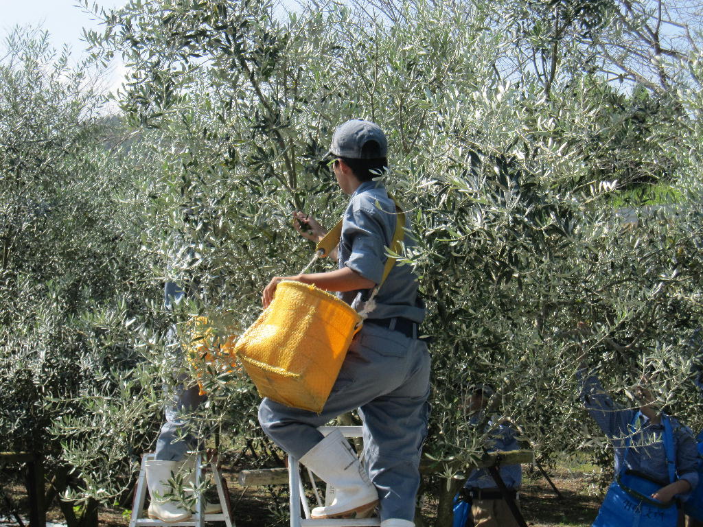 本校で栽培している「オリーブ」が収穫時期になったので生物生産科・生活科学科2年で一斉に収穫しました。オリーブオイルにするためには、24時間で一定の量が無いと機械で絞れないので2クラスで収穫しました。