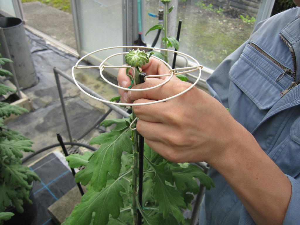 蕾(つぼみ)の付け根から2㎝のところに支柱の先端が来るようにし、蕾と支柱の先端の間に輪台を取り付けていきます。