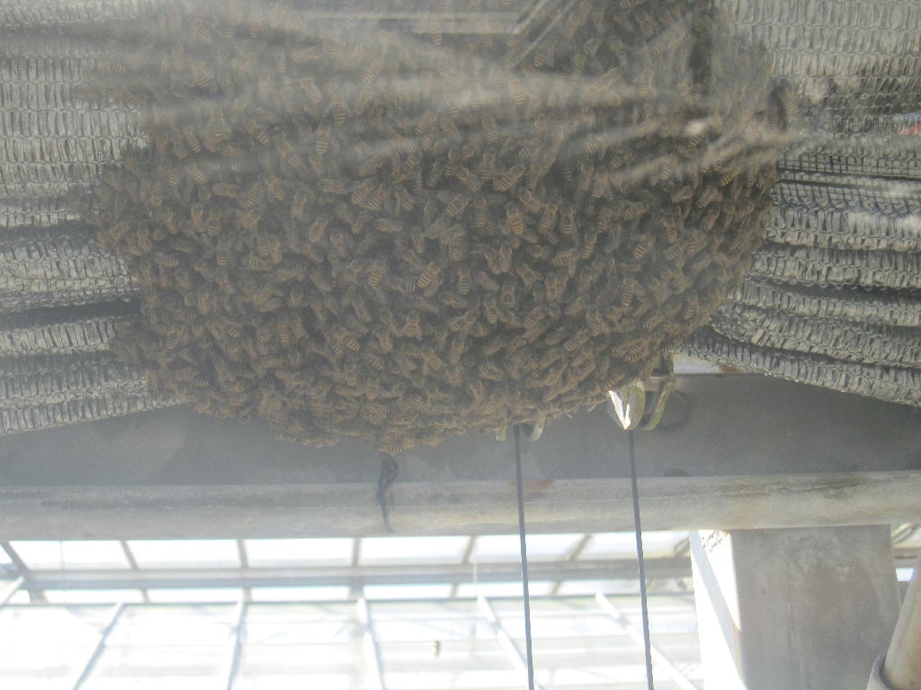 先週のことです!!!農場にいたら「ブーン。ブーン」とすごい音が聞こえてきて見に行ってみるとミツバチが今まで見たことも無いぐらい飛んでいます。そのまま、見守っていると草花温室の外部遮光カーテンにくっついてしまいましたΣ( ̄□ ̄;)