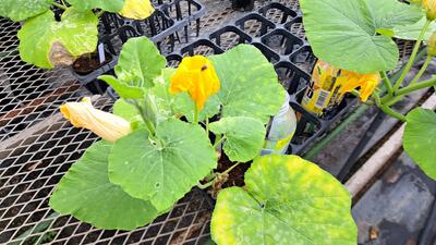 苗も大きくなり、花をつけていました。大きくなりすぎて、葉が変色している苗もあり早く大きな畑に移してあげたいです。