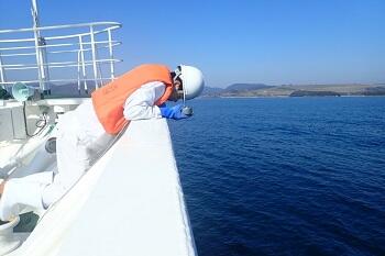 午前9時に揚錨し、正午12時に飯盛沖へ到着し、航行にあたっては事前に生徒が作成した航海予定をもとに、時間やコストの観点から一部修正を加えて実施しました。航海計画の作成については、初期と比べて改善点が少なくなり、作業時間も短縮されるなど、生徒の成長が感じられます。