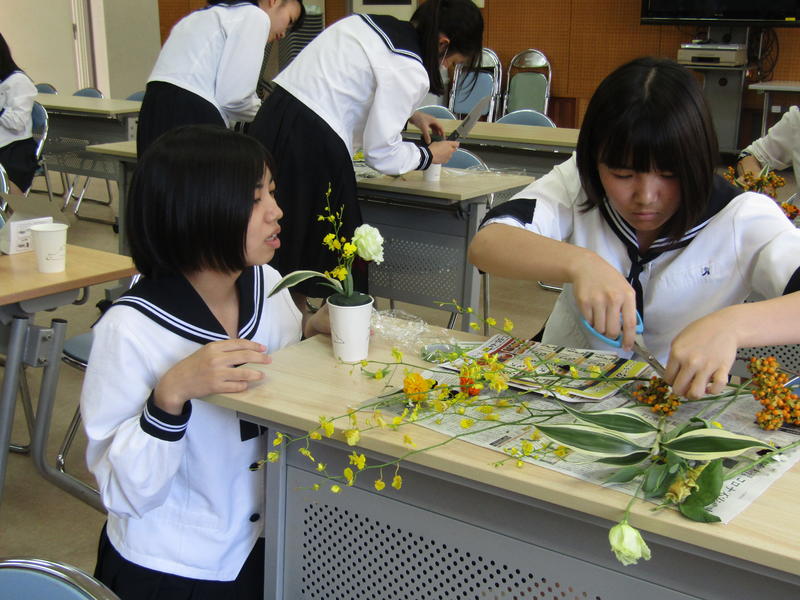 生活科学科では、生花の消費拡大に向けた取組みの一環として、熊本県産の花材を用いたフラワーアレンジメント作りについての学習を行っています。