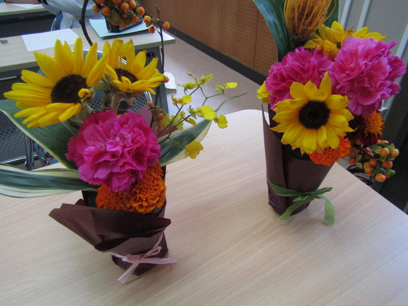 そして、まだ使用できる花材は、授業で卓上フラワーアレンジメントの材料として用いました。