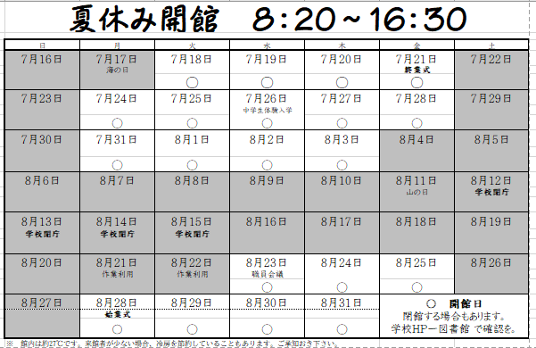 夏休み期間は、下記の○の日が図書館開館日です。(2022.7.18版 変更する場合もあります)