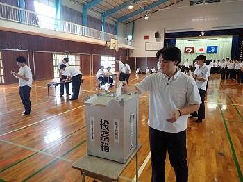 最後に苓北町役場からお借りした投票箱を使い、本当の選挙さながらに投票を行いました。運営にあたった選挙管理委員会および立候補者、応援責任者のみなさんお疲れさまでした。