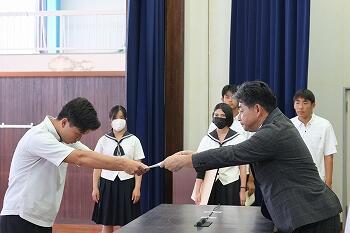 はじめに行われた表彰式では、「令和6年度子供の読書活動優秀実践校文部科学大臣表彰」、「九州地区水産系高等学校産業教育意見・体験発表会 奨励賞」、「じもと探究EXPO探究コンテスト2024グランプリ」、「新体力テスト優秀者」が表彰を受けました。1学期もさまざまな場面で活躍が光りました。
