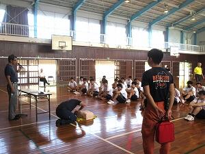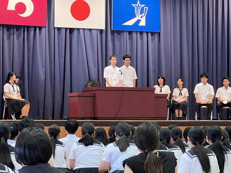 全校集会では、今月の目標である「夏バテに負けるな!」の提言やメディア委員会から夏休みの本の貸し出しについてのほかに、今週金曜日に行われる生徒会役員選挙に向けての注意事項などが全校生徒に伝えられました。