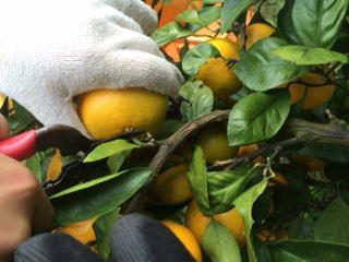 ミカンの収穫は少し特殊で二度切りをします。収穫した際に果柄枝が長いままだとミカン同士で果皮に傷が入ってしまうのでこのようにミカンは収穫していきます。