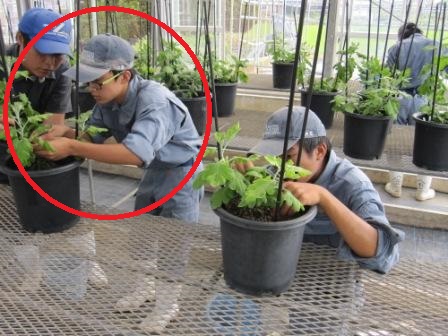 そんな中、お昼を過ぎた頃、農場に実習服を着た3年生の野菜専攻生3人が登場します。今回はミニトマト「ピンキー」「キラーズ」を定植するそうです。