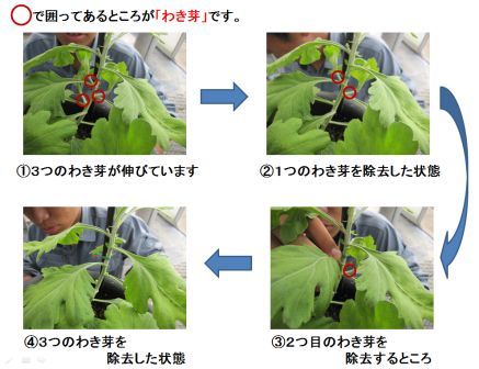 「わき芽」を放置していると「わき芽」にも栄養が行ってしまい、小さな花しか咲かなくなるので「わき芽」はきれいに取ってしまいます。