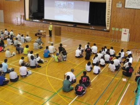 体育館では天草広域連合中央消防署の方から講話を頂き、災害発生時でしてはならないことは「お・か・し」