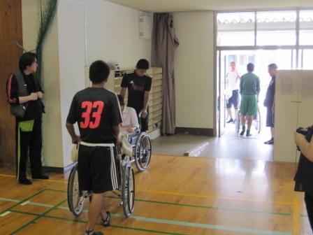 講演後は、車いすの補助体験をしました。初めての体験でしたが、生徒達は地域の方を乗せ、スロープを乗っている人に恐怖心を与えないように後ろ向きでゆっくりと降りていくことが出来ました。
