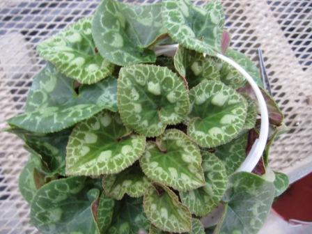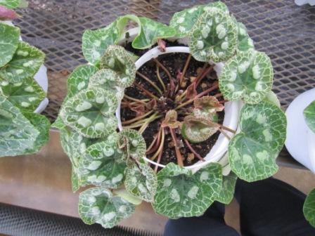 生徒や購入されに来られた人が「良いシクラメンって、どんなのですか??」という質問をよくされます。それは、葉が多いものを選んだ方が良いと思います。葉が多いと言うことは「芽点」が多いと言うことです。「芽点」とは「葉芽」と「花芽」が出来るところです。