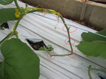 メロンの摘心です。摘心することで、葉の付け根から芽(えき芽)が形成され、それが伸びると分枝(側枝)となり、そこに雌花がついて受粉させてメロンを作っていきます。