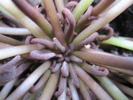 写真3ではさらに芽点を分解してみました。葉の下になんかくっついています。なんでしょう???写真4は写真3のくっついているのをアップにした物です。よーく見てみると花芽がくっついています。シクラメンの花は葉の付け根から1輪咲いてくるみたいですね。