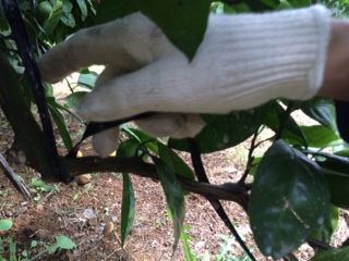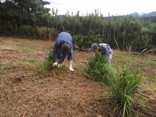 今年の4月に2年生で定植した「肥のひかり」の周りの草を鎌(かま)で草刈りをしました。