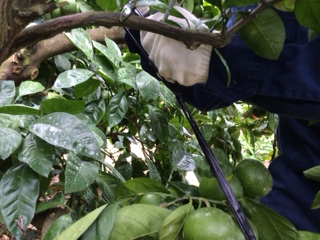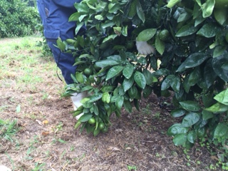 豊福(ミカン)が実の重さで枝が地面についてしまっています。そのままにしていると、ナメクジが食害したり、草などにこすれて果皮に傷が付いてしまい、商品価値が著しく落ちてしまいます。