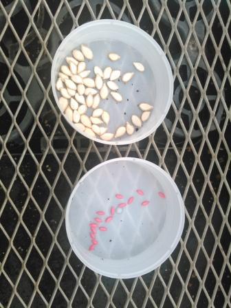 ピンク色がキュウリで少し大きいのがカボチャです。キュウリの種はピンク色ではありません。カボチャと同じ色です。本当は。では、なぜ??ピンク色になっているのでしょう???