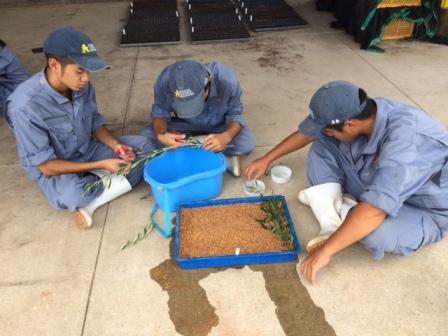 植物バイオテクノロジーでオリーブの挿し木を行いました。挿し木よる繁殖方法を楽しく学びました。