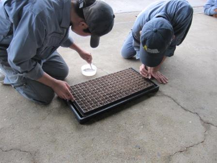 今回、生徒達は200穴セルトレイに一つ一つピンセットで摘んで置いていきます。セルの中に2個3個入らないように注意します。一つのセルから一株発芽するはずなので、もし2~3株発芽したらすぐばれます。