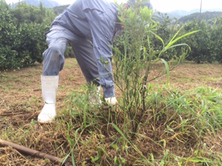 定植して約6ヶ月なので幹も細く草刈り機で刈ると間違って切ってしまうかもしれないので手刈りです。