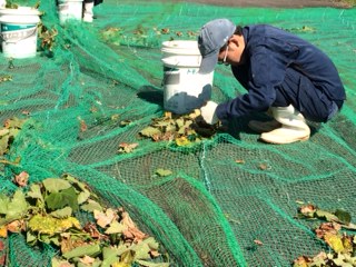 来年のため、防鳥ネットを片付けます。そのままでは、枝がネットに絡んで剪定(せんてい)しにくく、また、ネットが劣化してしまうので、絡まった葉や枝をきれいに取って、片づけます。