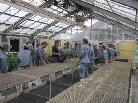 実習中はずーーーーーっと腰を曲げている状態で「葉組み」を行って行きます。さすがに腰が痛くなるので背伸びしたり、腰を叩いてほぐしたりします。これだけ大変な実習ですが、生徒たちは集中して取り組んでいます。