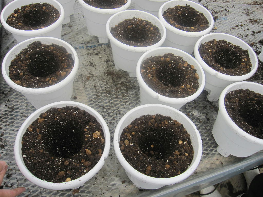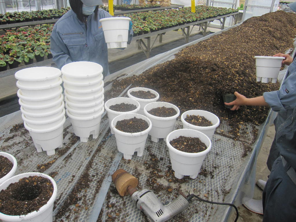 鉢に蒸気消毒された清潔な土を詰めていきます。土の量が同じになるようにします。鉢内の土の容量が違うと後々の肥培管理や水管理が大変です(>_<)