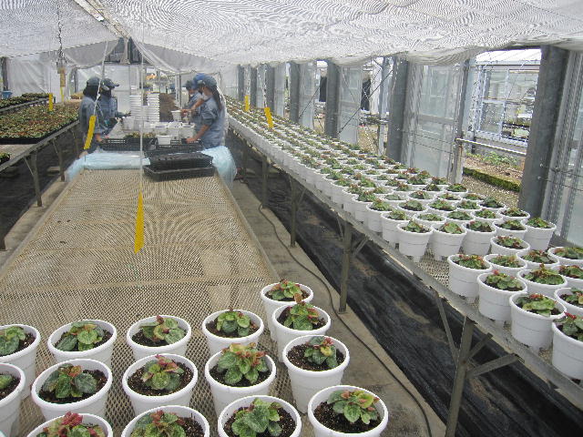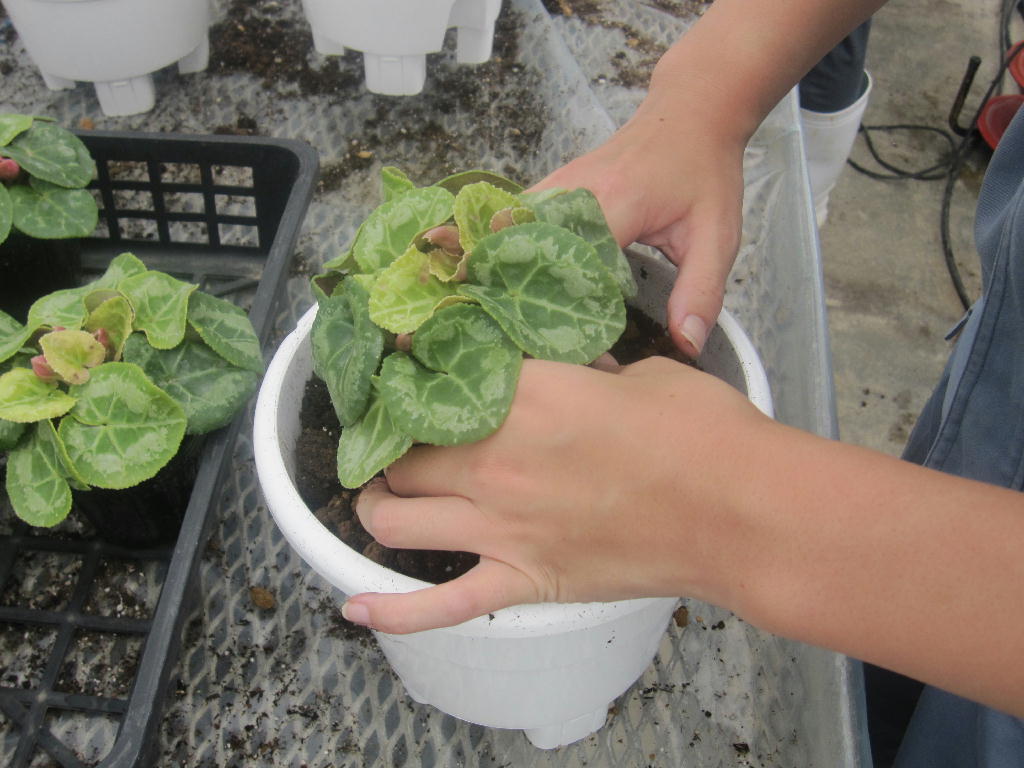 今日から本格的にシクラメンの鉢替えを行いました。鉢替えとは今まで栽培していた3号ポットから大きな鉢(6号鉢)に植え替えることです。