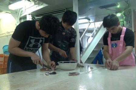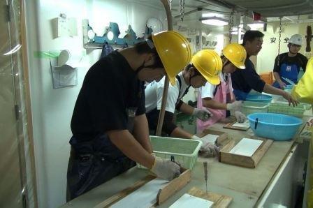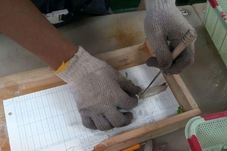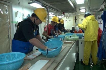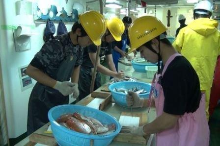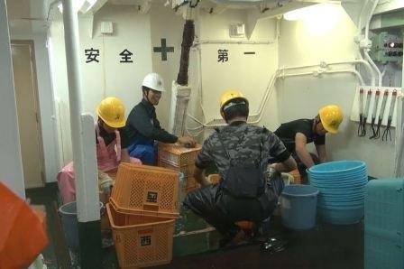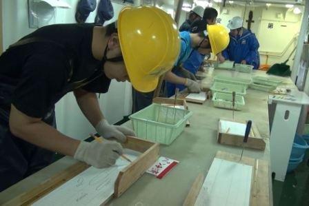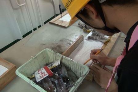 ケンサキイカの体長測定中! みんなで調査作業中!