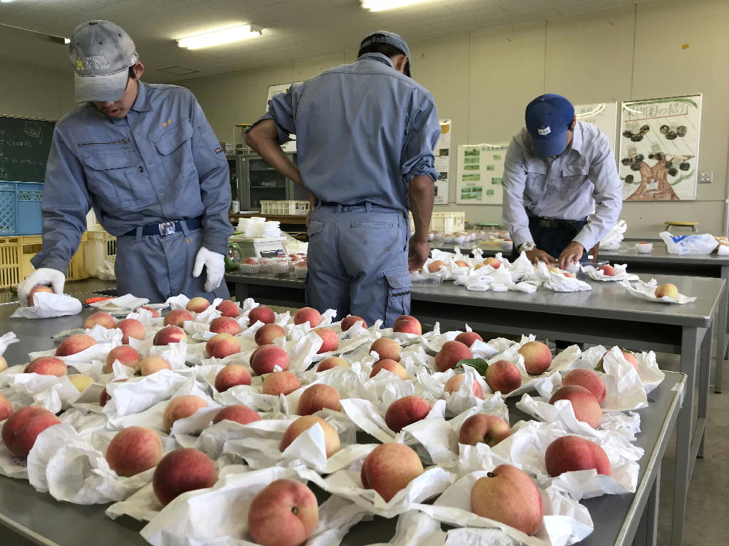 モモは、袋がけ等の防除をしても「シンクイムシ」という害虫の被害果が出てしまいます。そのモモを捨てるのはもったいない!ということで、2年生物生産科の「総合実習」と3年生物生産科の「果樹専攻」の授業で取り組みました。一晩冷やして、それぞれの授業で試食をしたいと思います。この機会に旬の味覚をしっかりと堪能してくれれば幸いです。