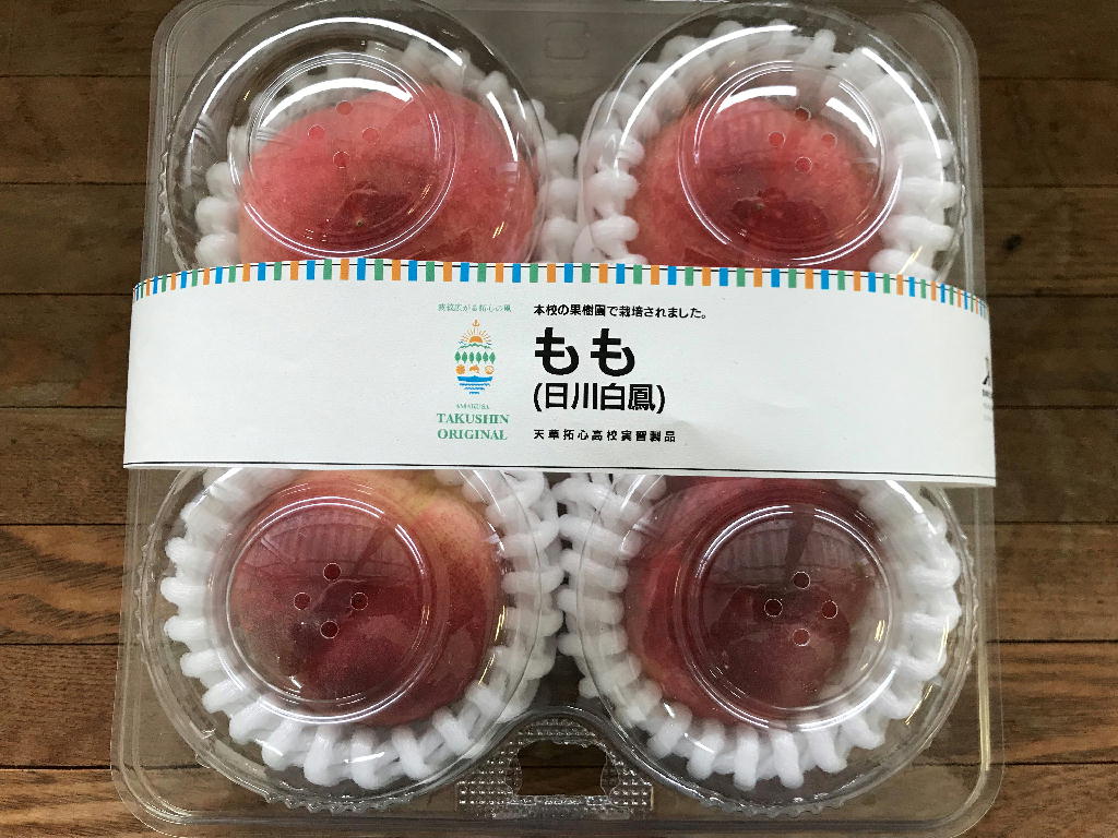 本日より生物生産科の果樹専攻生が露地で栽培しているモモの販売を開始しました。品種は日川白鳳といい、果肉がとてもジューシーで酸味が少ないのが特徴の品種です。今年は天候にも恵まれ、糖度は13度程度と良好です。本校へお越しの際はぜひ本泉果樹園までお尋ねください。