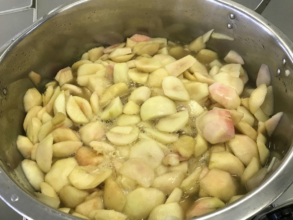 今日は梅雨らしい雨の一日となりました。果樹園では、規格外のモモを活用して「モモのコンポート(薄い砂糖水で煮て作る果物の保存方法)」作りに挑戦しました。