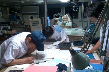 出港後は錨泊をし、錨泊方法や形象物等に関して学ぶことができた。