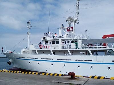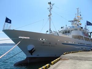 富岡港に入港しました。航海初日、波が高く、船酔いする生徒も見られま