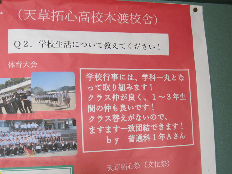 生徒会による天草拓心高校の説明です。本渡校舎は5学科「普通科」「商業科」「生物生産科」「食品科学科」「生活科学科」からなる総合高校です。各学科、特色ある教育活動の中で「生徒一人ひとりの創造性と探究心を培い、未来を切り拓く人財」を育成しています。