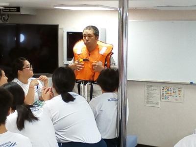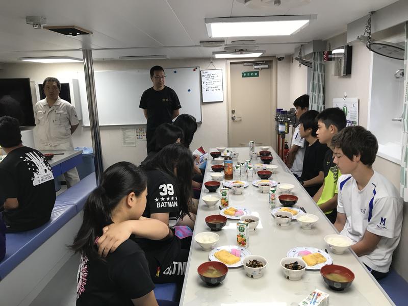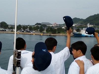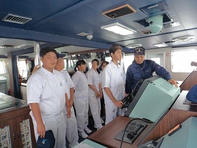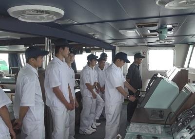 ↑ 出港時に指導教官の説明に熱心に聞き入る生徒たち