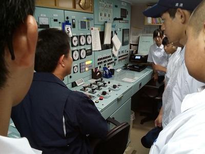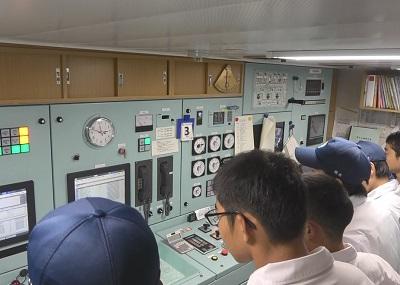 ↓ 船員の方々や本校職員から船内の説明を受ける生徒たち