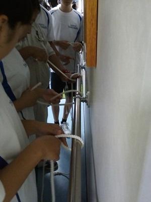 ↓ 船内で「ロープワーク」を学ぶ生徒たち ↓ 船から見たマリン校舎