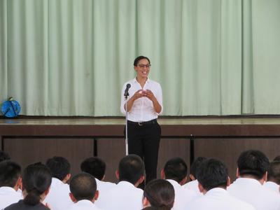 全体会では本校生徒が学校生活や寮の紹介、各学科の紹介を行いました。