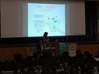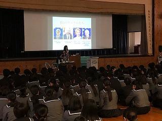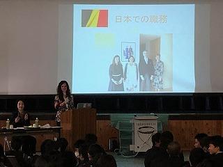 令和元年11月7日(木)ベルギー大使館のエリザ・カスタルド公使参事官が本渡校舎を訪れ、EUについて理解を深める講演会が実施された。日本の若者(高校生等)にEUを身近に感じてもらおうと、駐日EU代表部がEU加盟国の外交官による講演会を開催している。今年は、全国の高校49校を訪問される予定で、熊本県では天草拓心高校本渡校舎のみとなる。EU(欧州連合)をわかりやすく説明いただき、質疑応答でも活発な意見が交わされた。