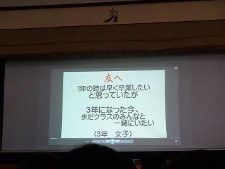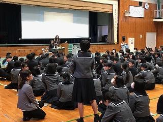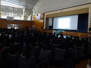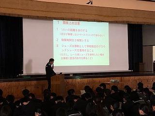 令和元年11月28日(木)、明日の長距離走大会に伴うコース説明会が全校生徒を対象に実施された。危険箇所やトイレポイント、給水ポイント、道路横断ポイント等が動画により説明され、安全第一で、自らの目標に向かって頑張るよう注意事項も含め説明会が行われた。