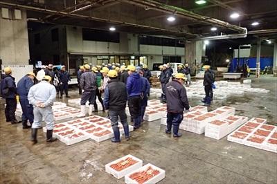 長崎魚市入港中。本日05:00水揚げ~05:50終了。