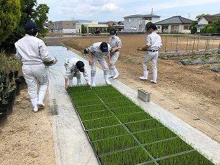 令和2年5月29日(金)生物生産科1年生の科目「農業と環境」の実習で、キュウリのコンテナ栽培に向けたキュウリ苗の定植を行いました。また、イネ苗の苗床作りも行い、1学期の栽培がスタートしました。