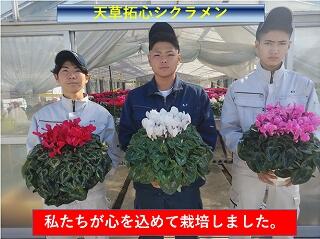 今年の天草拓心高校のシクラメンは、今話題のナノバブル水とFAJ(東京太田市場)での全国花き品評会シクラメン部門の上位生産者(栃木県、福島県、千葉県)の技術を導入して栽培しています。そして何より、生物生産科の草花専攻生が播種からここに至るまで、一生懸命、心を込めて栽培してきました。