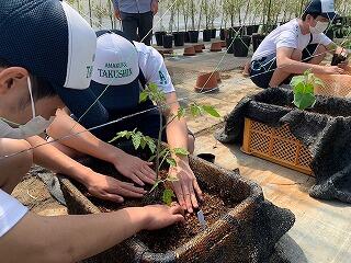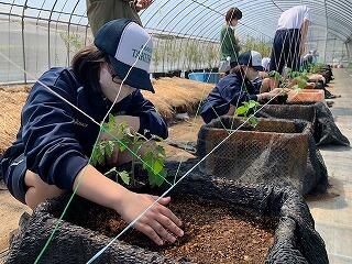 生物生産科1年生の『農業と環境』の公開授業(授業参観)にて、ミニトマトとキュウリの植え付け(定植)実習が行われました。コンテナを用い、一人一株ずつ丁寧に植え付けを行うことができました。授業参観ということもあり、保護者方々に農場までお越しいただき、実習の様子を参観していただけたことに感謝いたします。
