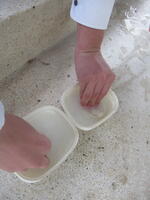 弾力が出て、伸びるようになったら水につけ、水中でもみ洗いをします。