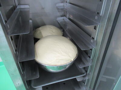 生地作りは大型ミキサーを使い、全員分まとめて捏ねました。一次発酵が終わるとこんなに膨らみました。