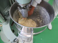 生地は大型ミキサーで仕込みます。しっかり捏ねて、実習開始時間に一次発酵終了を合わせます。